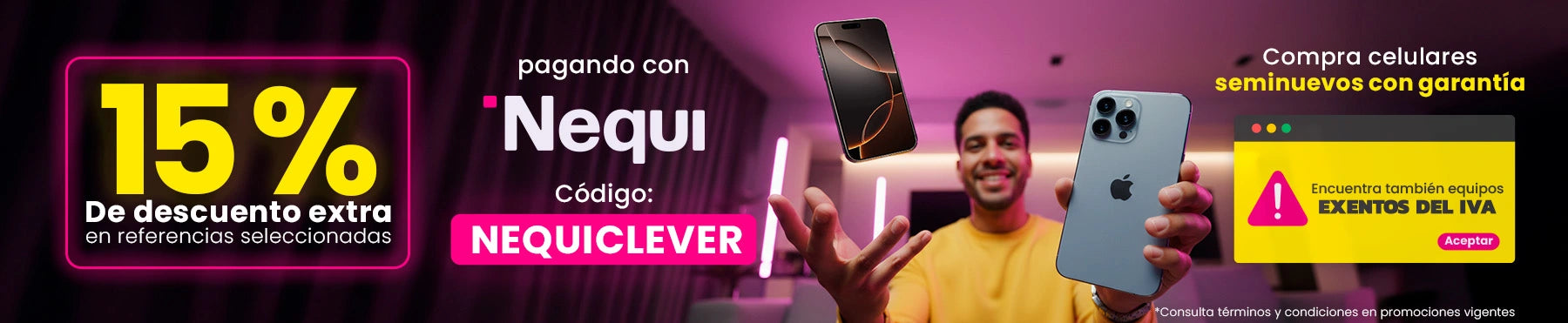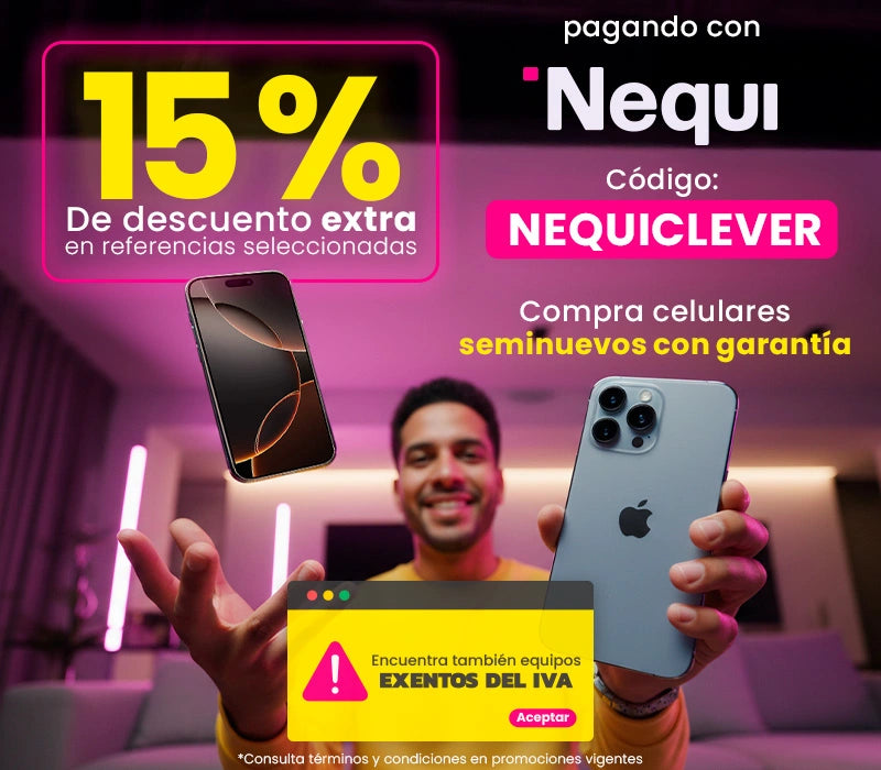 Términos y Condiciones de la promoción NEQUICLEVER: Promoción vigente del 26 de enero al 9 de febrero de 2026, o hasta agotar existencias, lo que ocurra primero. Aplica únicamente para referencias seleccionadas disponibles en la colección denominada “Nequi” verla aquí: https://www.clevercel.co/collections/nequi. Válida exclusivamente en la tienda en línea www.clevercel.co. Para obtener el 15% de descuento, el cliente deberá ingresar el código NEQUICLEVER al momento de finalizar la compra y seleccionar Nequi como método de pago. Aplican los Términos y Condiciones de venta en línea de Clevercel Colombia y de las Promociones Vigentes. Para conocer los Términos y Condiciones de Nequi, están disponibles aquí: Condiciones de uso.